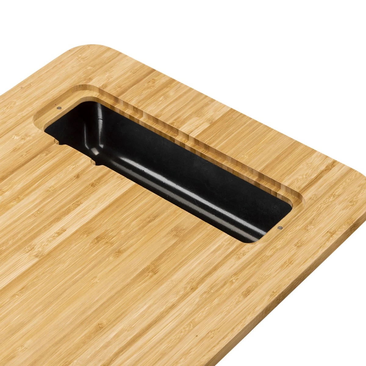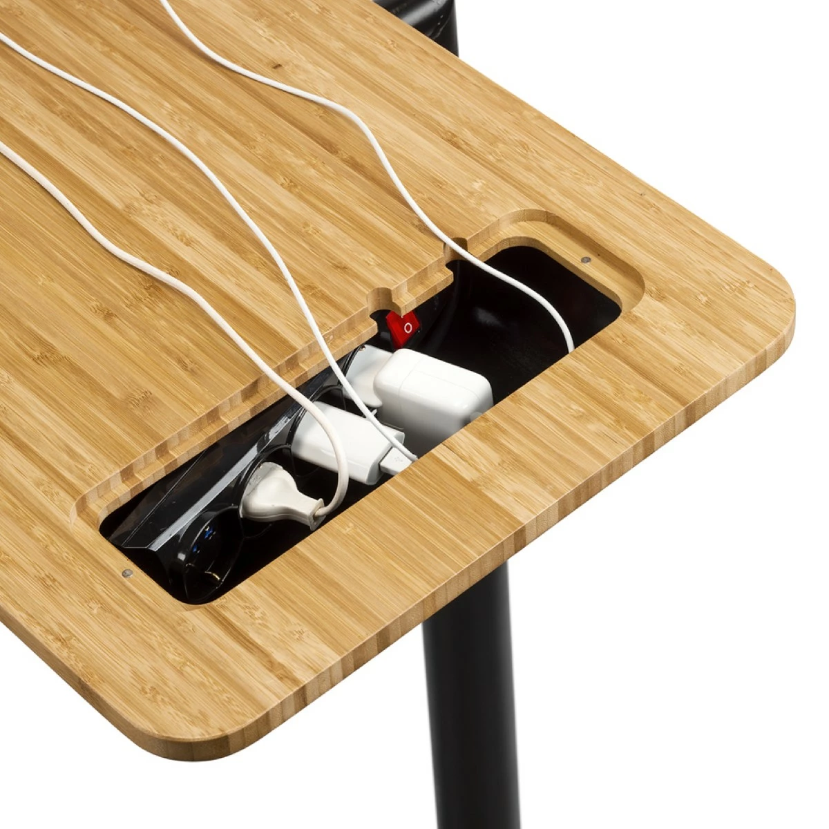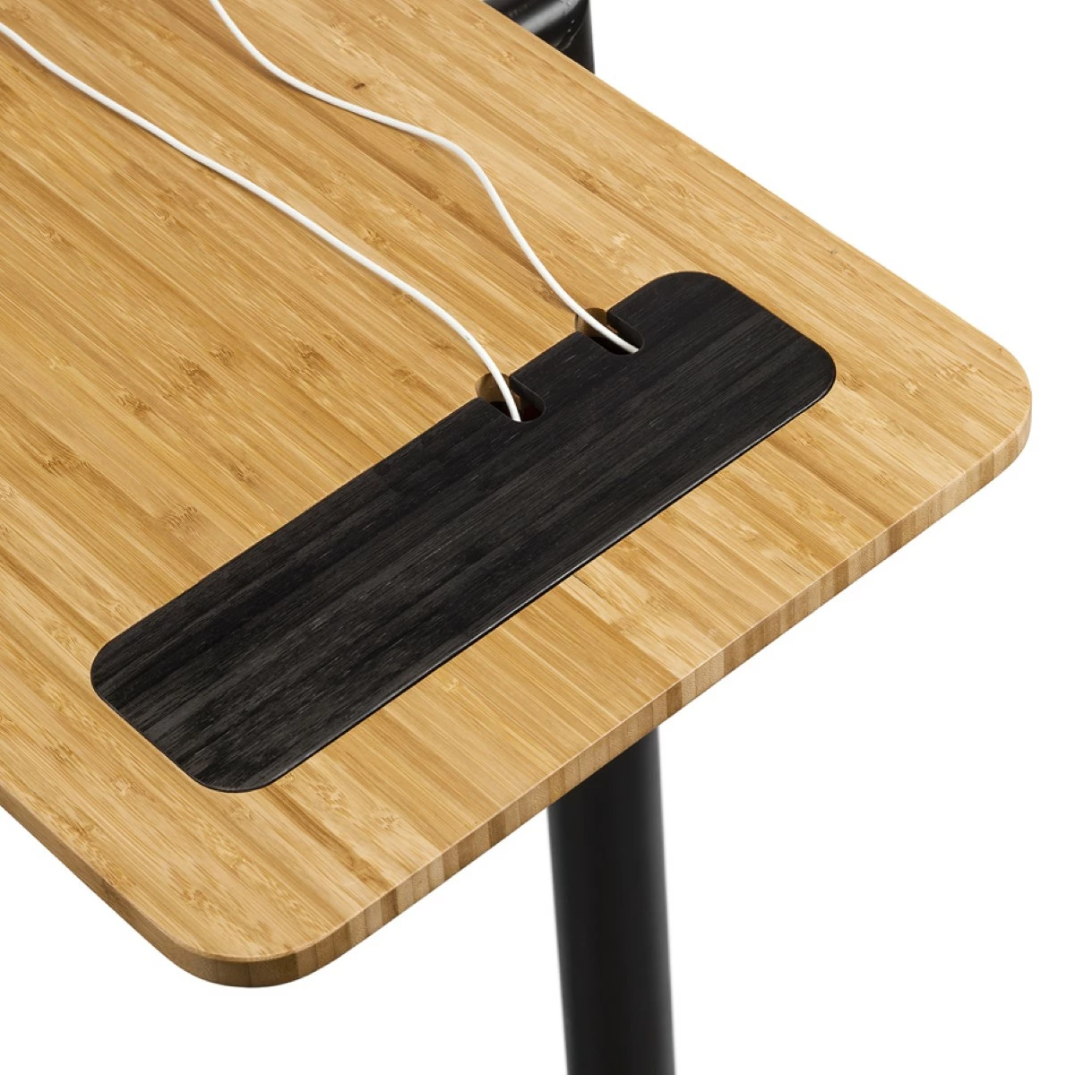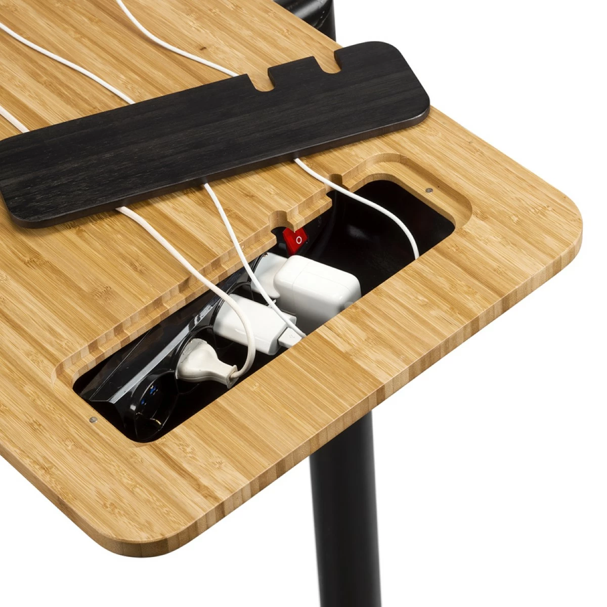 Bordplaten har tre svarte plater hvor du kan ha pc-en, tablet/telefon og muligens en boks. Under den lange smale platen er det et rom der du kan ha en strømskinne liggende, slik at den fungerer som en ledning skjuler.