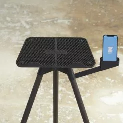 På det ene benet kan den medfølgende telefonholderen monteres.