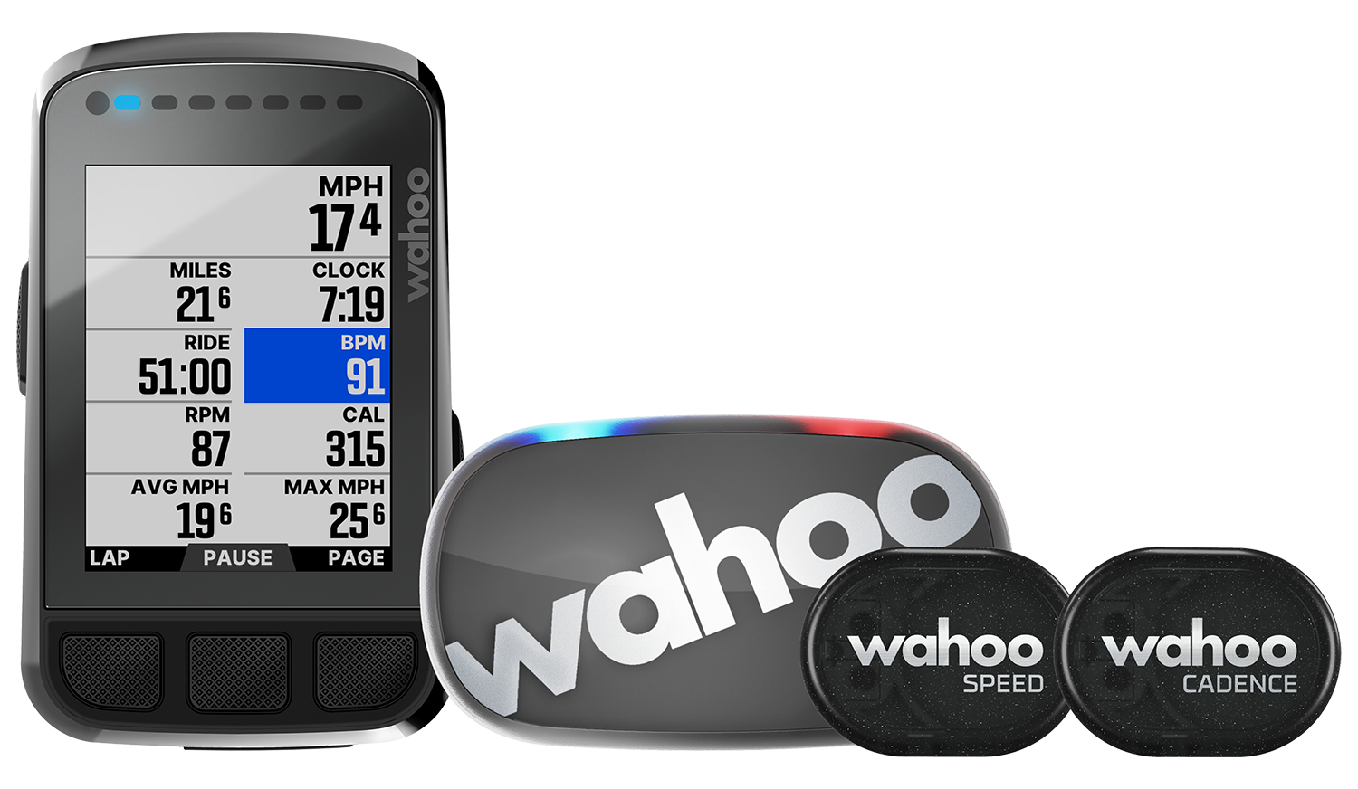 Inkludert i pakken er Wahoo RPM-hastighetssensor, Wahoo Tickr Gen 2 pulsbelte og Wahoo RPM-tråkksensor.